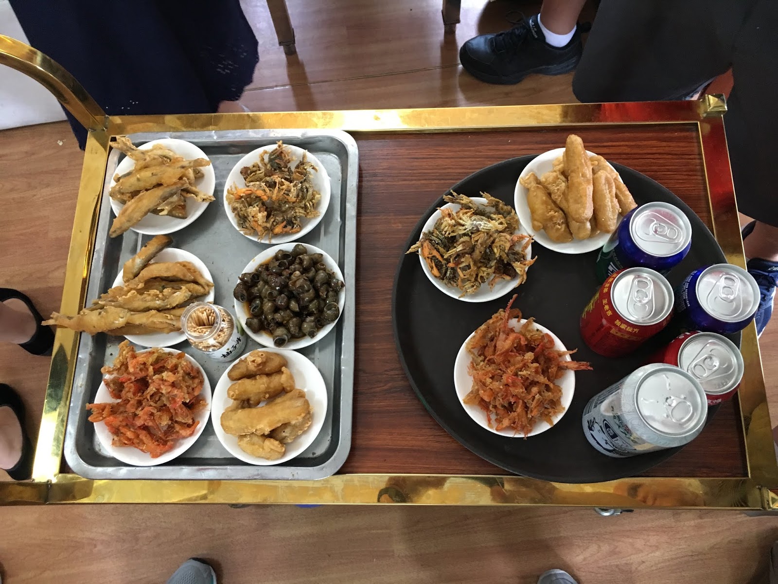 board: fried taro root, river crabs, river snails, fish, and tiny